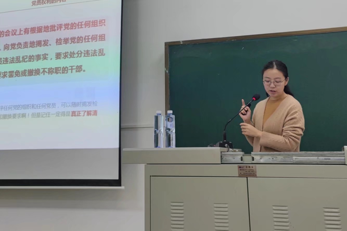 最后胡小娱老师介绍了党员的权利。党员的权利是神圣的,但同时也要注意正确行使权利,不能用来谋取个人私科的老师系统计解了中国共产党员的条件、义务、权利,告诉在座的入党积极分子,党员是一种奉献和牺牲,每位党员和积极向党组织靠拢的同志都应标准严格要求自己,加强理论学习,增强工作能力,为党旗增辉,为党和人民的事业而不懈奋斗。