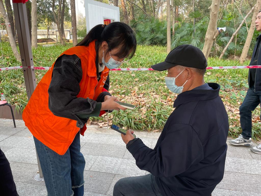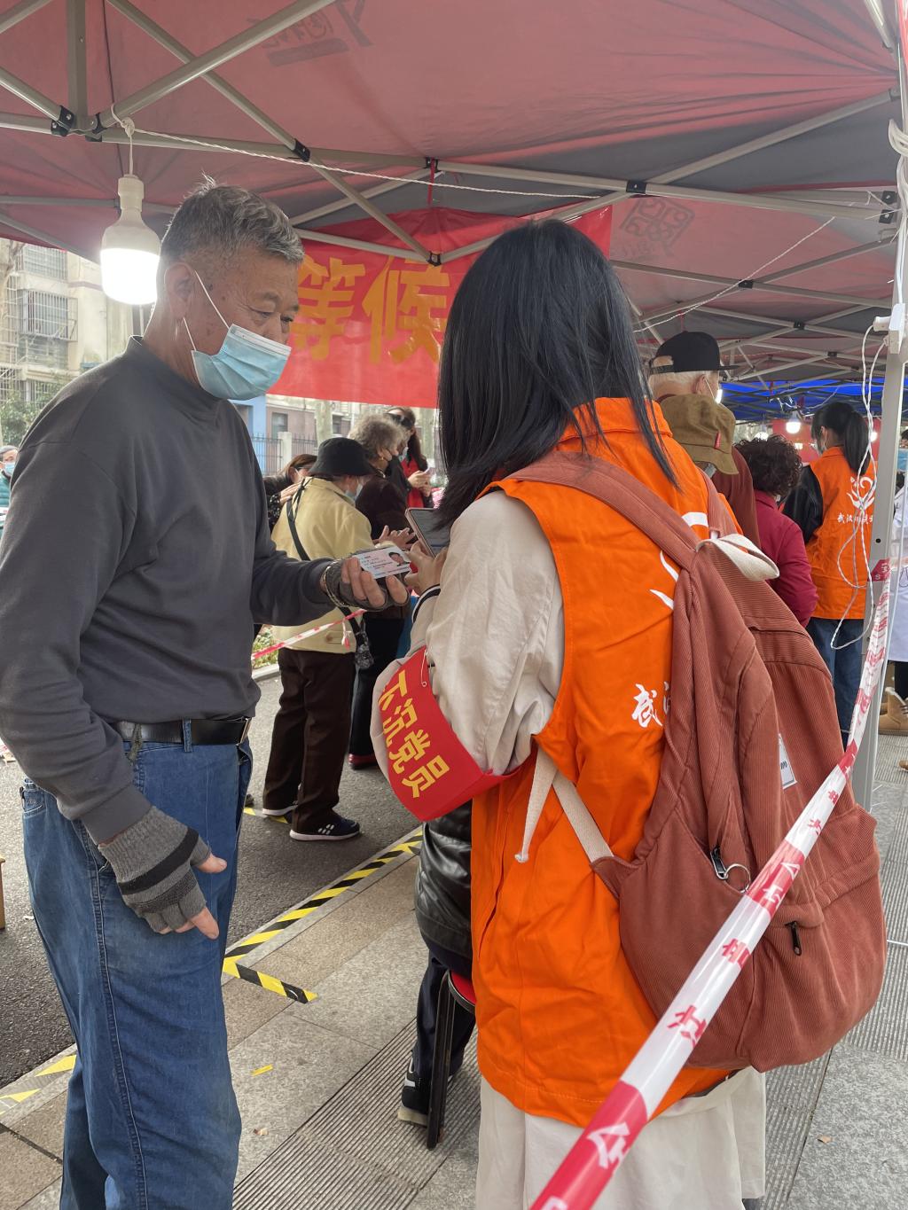 虽然核酸检测开始时间是下午三点半,但志愿者们早早到达现场,协助社区布置现场、消毒杀菌、搬运物资等。检测开始后,引导居民扫码测温,维持现场秩序,提醒大家准备好健康码或身份证,确保检测工作有序开展。