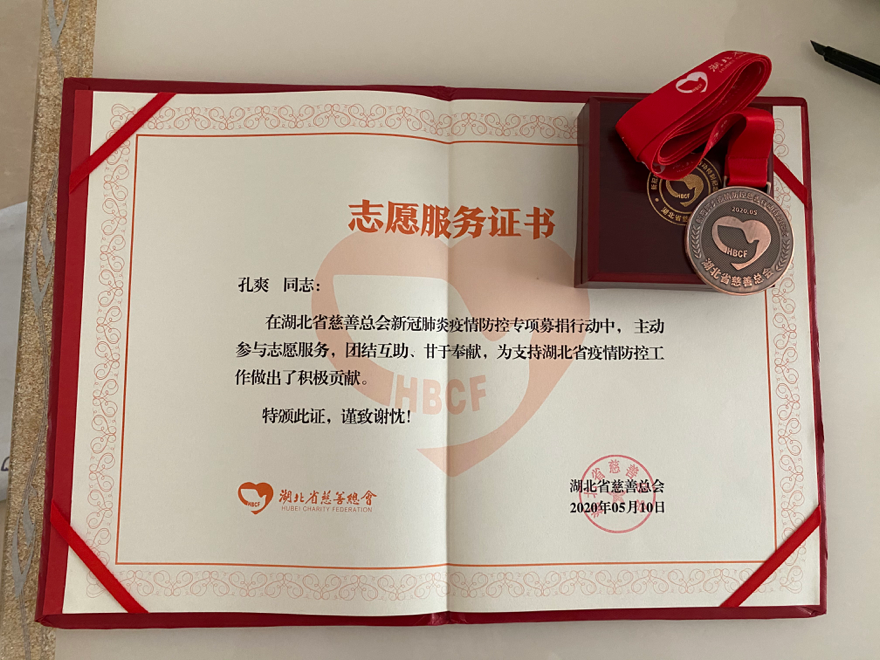 近日,孔爽同学收到了湖北省慈善总会寄出的志愿服务证书和新冠肺炎疫情防控慈善行动特别纪念章。