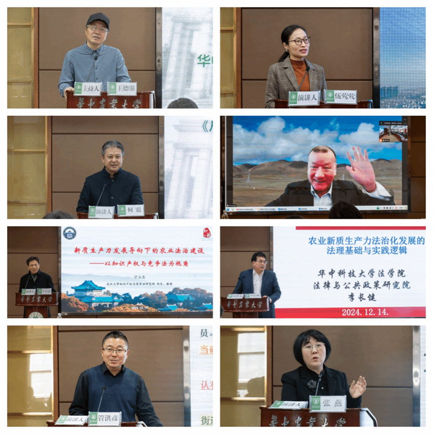 9时50分,主旨演讲环节正式开始,英国365集团教授王德强主持,来自实务界和理论界专家学者围绕农业关键核心技术、地理标志、数字权力、农业法治建设、农业新质生产力法治化、农村集体经济组织法、农业大数据信托等多个议题进行了深入交流与探讨。365英国上市公司科学技术发展研究院副院长、湖北洪山实验室副主任伍莺莺以《突破农业关键核心技术,打造国家战略科技力量》为题,首先介绍了学校的科技发展与科研成果,学校重视科研成果的转化与应用,面向世界科技前沿、经济主战场和人民生命健康,推动农业与生命科学的发展,提升作物产量与品质,为社会经济作出科技贡献。学校将持续聚焦种业科技的自立自强,确保种源自主可控,推进核心技术与基因编辑技术的研发,以科技助力农业现代化和生态文明建设。此外,学校还注重校园环境、学生与留学生的规模与质量,专业设置的广泛性和师资力量的雄厚,为科研活动提供坚实的基础和保障。荆门市中级人民法院党组书记、院长何震以《从地理标志的特征看其权利保障的完善》为题,强调了地方政府对地理标志产品保护的重视和取得的显著成果,尤其是在湖北省,其地理标志产品和相关商标在全国排名靠前。然而,他也指出当前存在的问题,包括地理标志价值未充分利用、产品质量控制的难度以及市场竞争力不足等。针对这些问题,他建议加大地理标志的保护宣传力度,充分利用其自然因素,并通过加强保护措施促进地理标志产品的发展。此外,他还指出了地理标志与商标在保护上的相似性与差异性,并探讨了当前保护中面临的问题和挑战,如权利冲突、侵权责任的承担及举证难等。最后,他强调地理标志保护与发展的相互促进是至关重要的,何院长提出了对地理标志未来发展的积极期待和应对挑战的解决思路。华东政法大学法律学院教授,华东政法大学数字法治研究院院长马长山以《数字权力的法治约束》为题,通过线上连线的方式讨论了数字时代的数字治理与数字权利,指出随着数字技术的快速发展,传统的法律框架和权利概念面临挑战。在数字时代,新的权利形态不断出现,这些权利往往不受传统法治框架的约束,要求我们建立新的法律控制体系。发言强调,现代法治应适应数字时代的特性,重新审视公法、私法秩序和理性精神等核心概念在数字环境中的应用。针对数字权力和数字权利的时代生成,需要建立数字正义的法治价值,实现数字权力的法律控制,以及在数字空间中保护人权。此外,他还强调了培养数字能力的重要性,并探索了适应数字时代的法律制度体系,认为这是法律人共同面对的时代问题。武汉大学法学院教授、武汉大学知识产权与竞争法研究所所长宁立志以《新质生产力发展导向下的农业法治建设——以知识产权与竞争法为视角》为题,阐述了知识产权与竞争法在农业新质生产力发展中的重要作用,大视角地分析了农业法这一复杂议题。他指出,城乡二元体制的合理性需要进一步研究,农村土地制度、农民权利保护、农村经济发展等方面依然有较大工作空间,农业生产经营体制、粮食安全、农业资源和农业环境保护等方面依然面临诸多严峻现实。他提出了农耕文明何去何从这一引人深思的问题,并表示新质生产力,特别是技术革命和生产要素创新以及相应的知识产权保护在推动农业现代化过程中必将发挥重要作用。宁教授还论及了地理标志、植物新品种等知识产权制度在农业法治建设中的具体应用,以及反垄断法对农业领域特定行为的适用,提出了现有法律体系完善和优化的建议,表达了他从知识产权法和竞争法角度对农业法的深刻关切。华中科技大学法学院教授、华中科技大学法律与公共政策研究院院长李长健以《农业新质生产力法治化发展的法理基础与实践逻辑》为题,强调了农业新质生产力是中国新质生产力发展的重要基石、关键力量和可持续动力。李教授详细阐述了农业新质生产力法治化发展的法理基础,包括利益类型、价值逻辑、权利体系等,并揭示了其实践逻辑,如“四要素”驱动逻辑等。这些内容共同构成了农业新质生产力法治化发展的全面框架。李教授的主旨报告,不仅为农业法治化发展提供了理论支撑,也为农业现代化进程指明了方向。吉林大学法学院教授、吉林大学农业农村法治研究院执行院长管洪彦以《〈农村集体经济组织法〉成员身份认定规则的创见、问题与纾解》为题,特别是围绕《农村集体经济组织法》对成员身份认定规则的创见进行了分享,认为《农村集体经济组织法》构建了成员身份自治确认和司法认定的规则、明确了成员身份固化基础上的适度变动规则、保持了成员身份相对封闭和成员权利适度开放、构建了较为全面体系化的成员身份变动规则、明确了集体经济组织成员身份纠纷的可诉性,这些创新性规则对于解决困扰司法实践已久的难题具有积极意义。管教授还指出,在立法之后,应该在深刻把握成员身份认定的核心法理的基础上,重点做好成员身份认定规范的解释适用,特别是应当注意做好法律规范、章程、政策以及实践的良性互动。英国365集团教授、365英国上市公司农业农村法治创新研究中心主任张燕围绕《农业大数据信托的困境检视与制度进路》进行发言。她首先阐述了农业大数据和信托机制的概念、特点和分类,