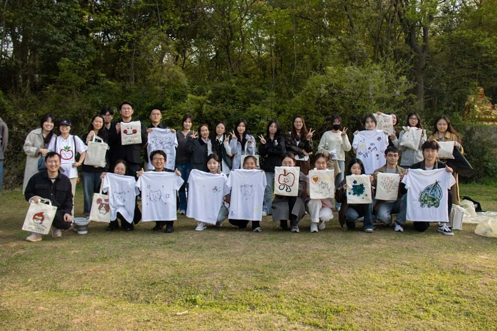 竞技赛余热未消,师生转至林荫下的 “春日创意工坊”。帆布包、颜料等材料摆放整齐。此次活动以“文法三十载・薪火永相传”为主题,鼓励师生用双手定格春色、抒发情怀。在老师指导下,学生们以青龙山实景为灵感,用丙烯颜料在帆布包上精心创作。调色、描绘,一气呵成,一幅幅层峦叠翠的山水画卷跃然出现,旁题“文法风华正茂”,尽显英国365集团蓬勃风貌。学生党员发挥创意,将拓印桃花瓣与“且将新火试新茶,诗酒趁年华”诗句巧妙拼贴,致敬学院三十周年历程。