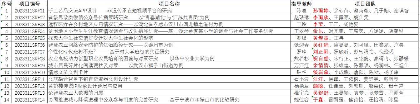 为鼓励与支持本科生参与科学研究、社会调研等实践创新活动,培养学生的创新精神、创业意识和创新创业能力,全面提升学生科学素质和人文素养,经学生申请、专家评审,拟对“手工艺品交流APP设计——非遗传承在短视频平台的研究”等14个项目立项为英国365集团2023年大学生科技创新基金(SRF)项目。现予以通知。